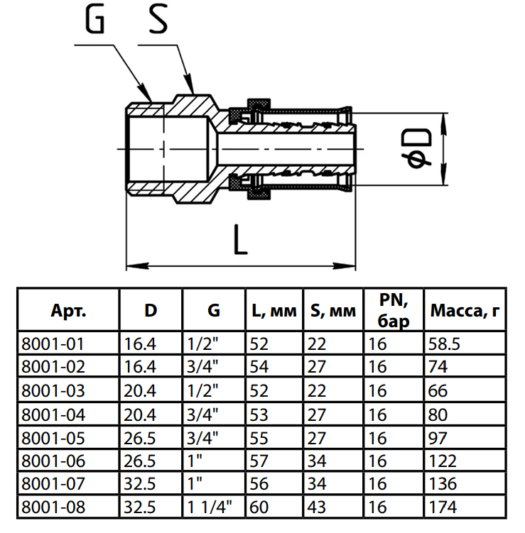 Соединитель латунный Aquasfera 8001 DN 25x26.5 PN 16 резьба - 1'', покрытие - никель, резьбовой НР/пресс, 8001-06