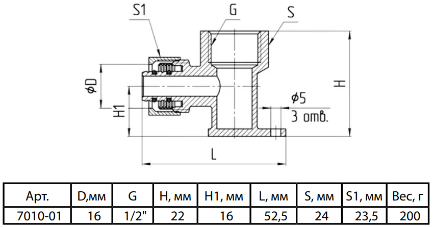 Тройник латунный Aquasfera 7010 DN 15x16 PN 16 резьба - 1/2'', покрытие - никель, с креплением, резьбовой ВР/компрессионный, 7010-01