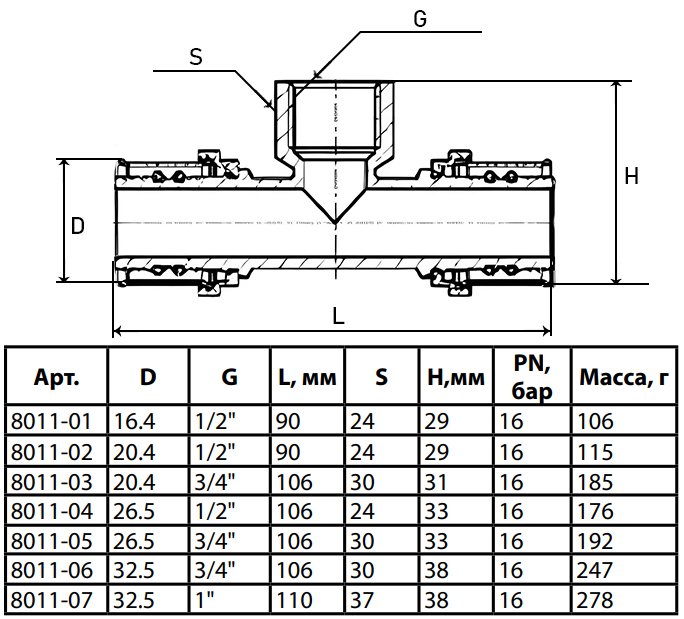 Тройник латунный Aquasfera 8011 DN 15x26.5 PN 16 резьба - 1/2'', покрытие - никель, резьбовой ВР/пресс, 8011-04