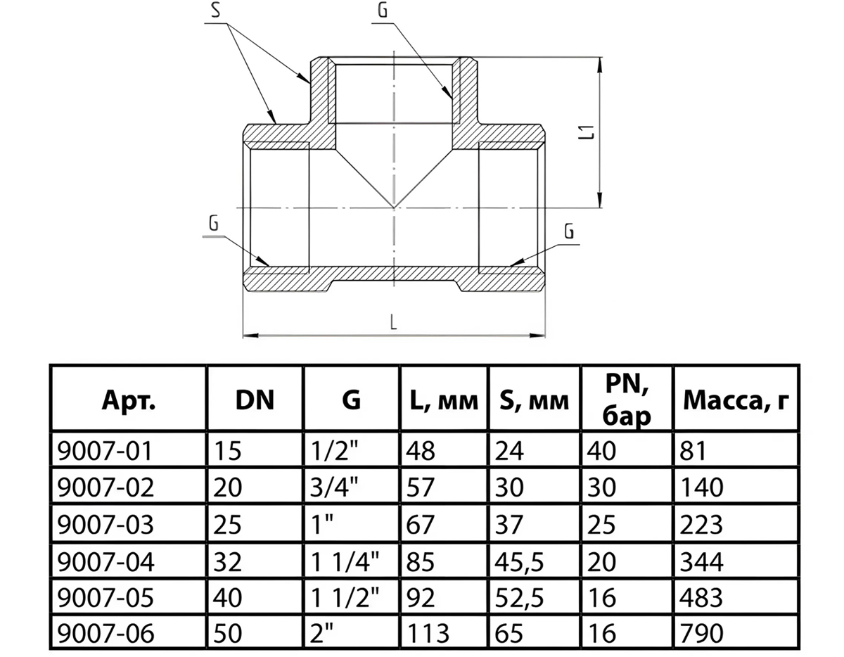 Тройник латунный Aquasfera 9007 DN 40 PN 16 резьба - 1 1/2'', покрытие - никель, резьбовой ВР-ВР-ВР, 9007-05