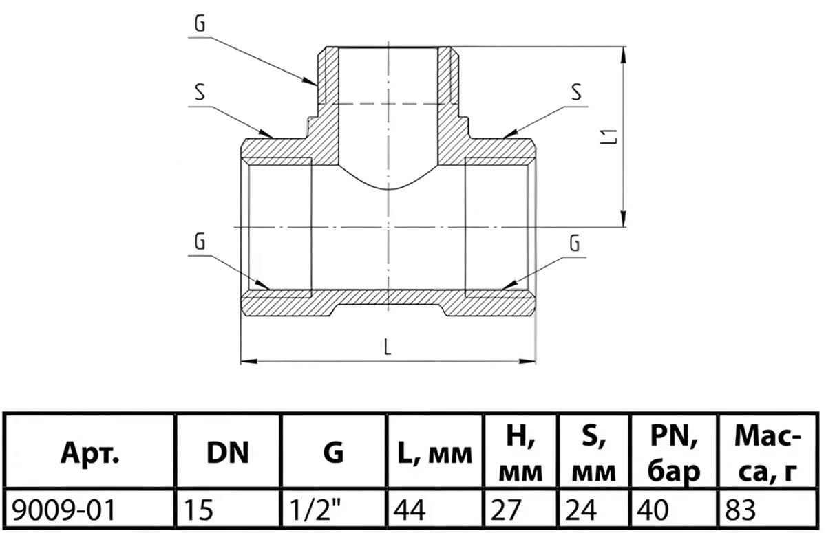 Тройник латунный Aquasfera 9009 DN 15 PN 40 резьба - 1/2'', покрытие - никель, резьбовой ВР-ВР-НР, 9009-01