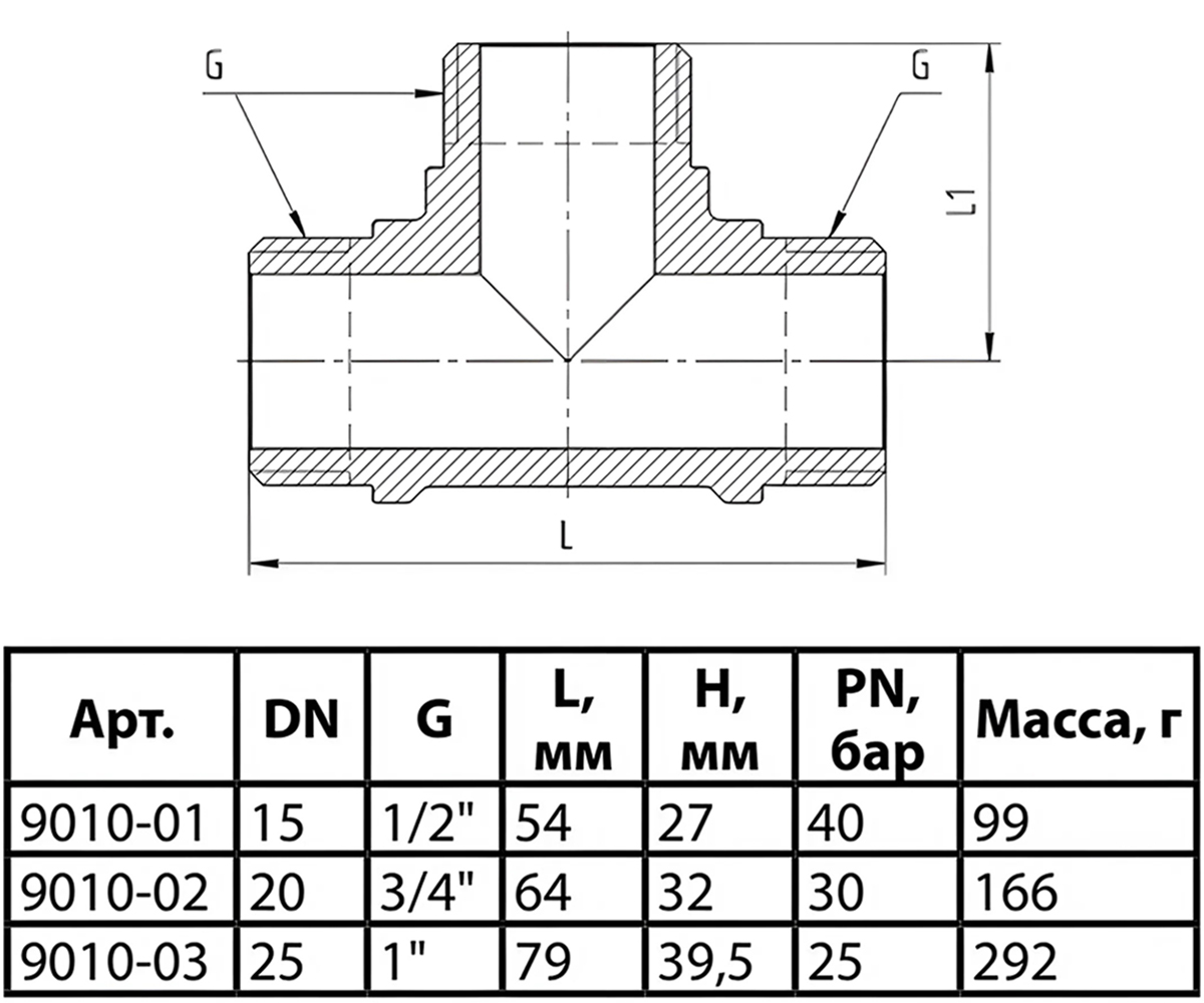 Тройник латунный Aquasfera 9010 DN 25 PN 25 резьба - 1'', покрытие - никель, резьбовой НР-НР-НР, 9010-03