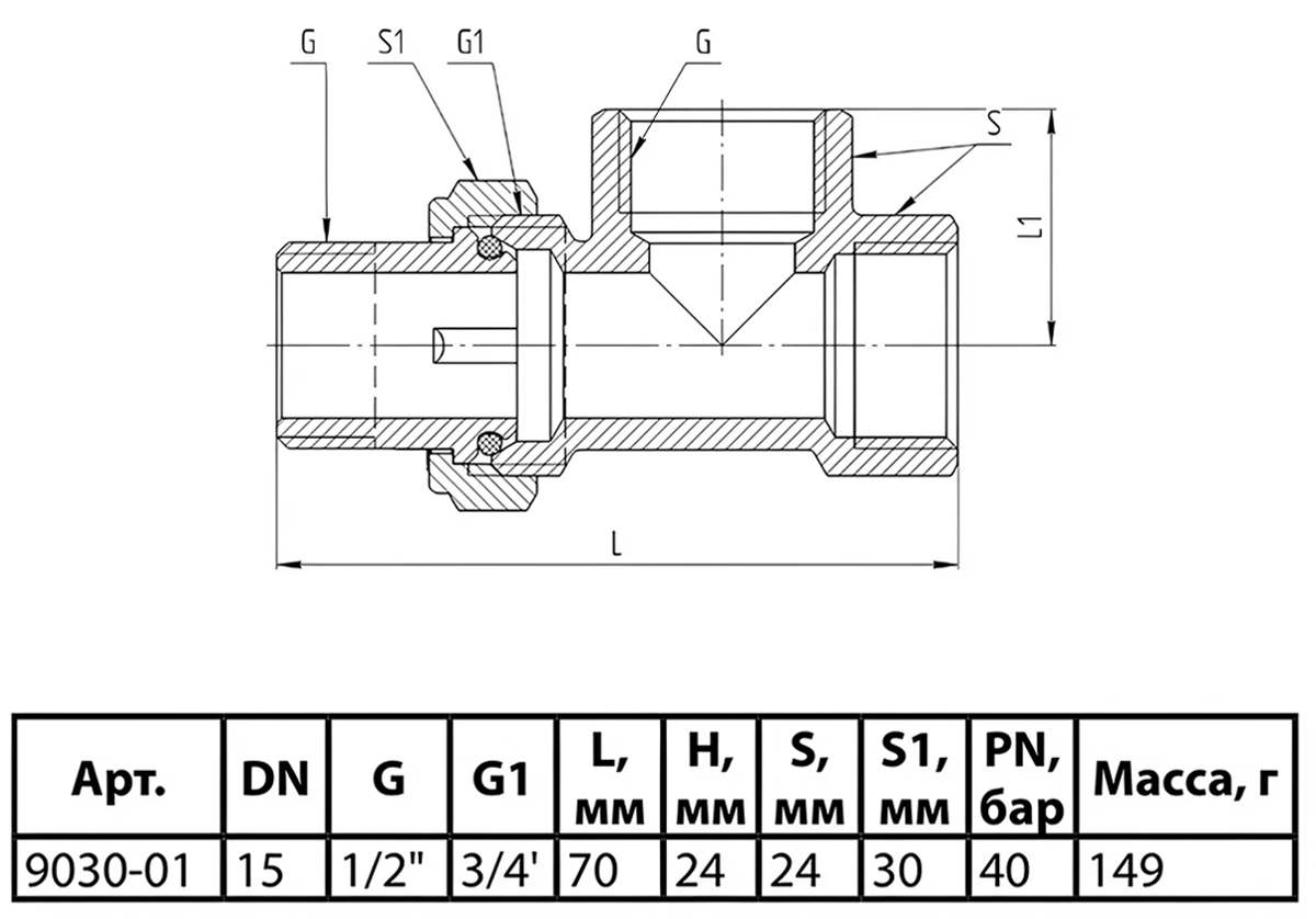 Тройник латунный Aquasfera 9030 DN 15 PN 40 резьба - 1/2'', покрытие - никель, резьбовой НР-НР-НР (американка), 9030-01