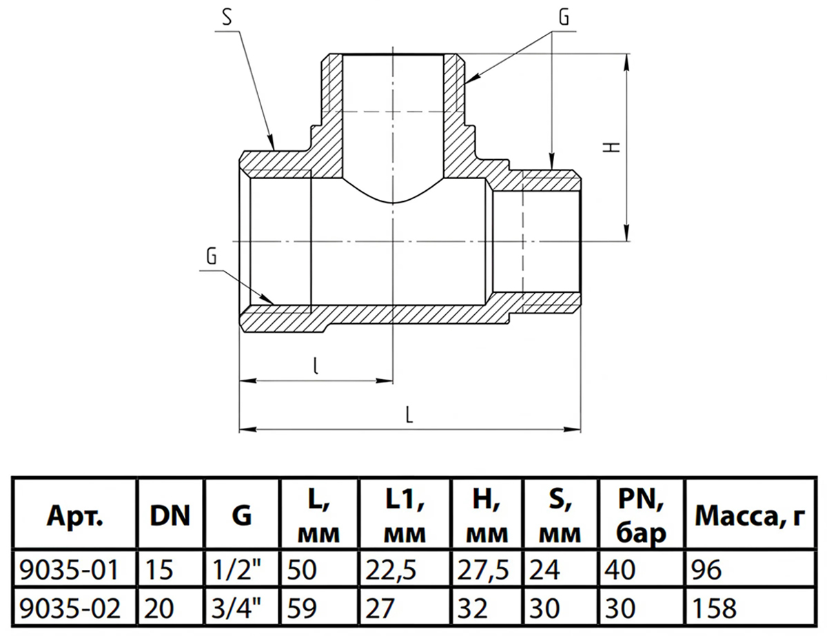 Тройник латунный Aquasfera 9035 DN 20 PN 30 резьба - 3/4'', покрытие - никель, резьбовой ВР-НР-НР (американка), 9035-02