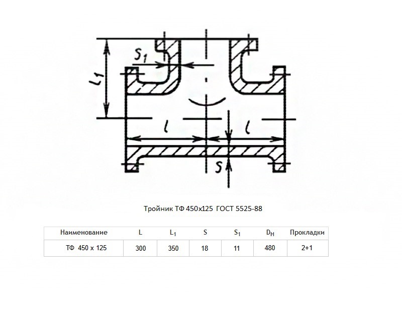 Тройник ТФ Ду 450х125 ВЧШГ ГОСТ 5525-88 чугунный фланцевый