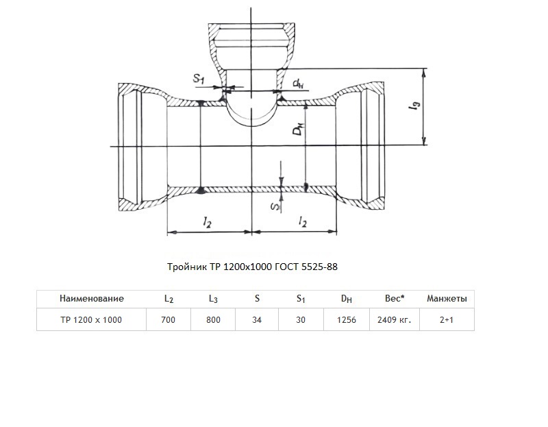 Тройник ТР Ду 1200х1000 ВЧШГ ГОСТ 5525-88 чугунный раструбный