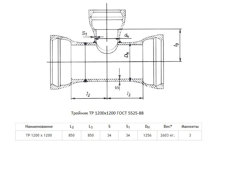 Тройник ТР Ду 1200х1200 ВЧШГ ГОСТ 5525-88 чугунный раструбный