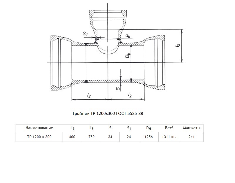 Тройник ТР Ду 1200х300 ВЧШГ ГОСТ 5525-88 чугунный раструбный