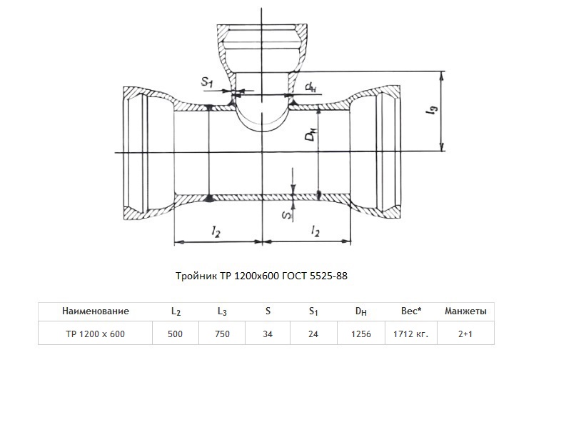 Тройник ТР Ду 1200х600 ВЧШГ ГОСТ 5525-88 чугунный раструбный