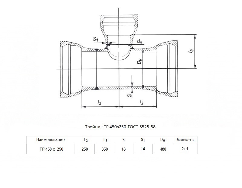 Тройник ТР Ду 450х250 ВЧШГ ГОСТ 5525-88 чугунный раструбный