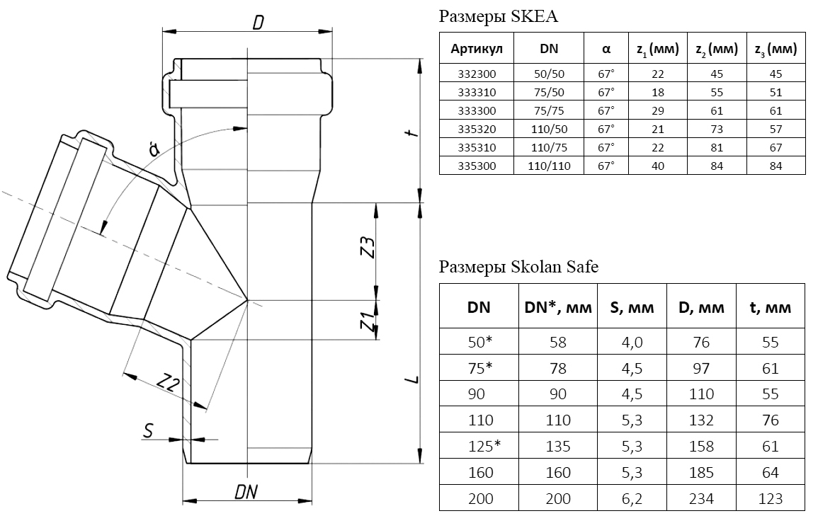 Тройник канализационный бесшумный PP-MD Ostendorf Skolan Safe SKEA DN 110/50х67°