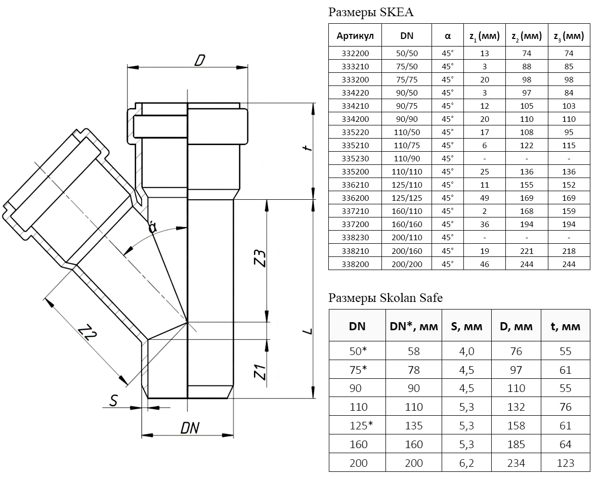 Тройник канализационный бесшумный PP-MD Ostendorf Skolan Safe SKEA DN 90/50х45°