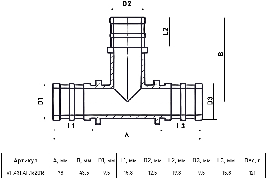 Тройник надвижной переходной VALFEX VF.431.AF Ду 16х20х16 Ру 16 латунный