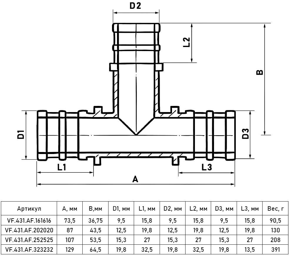 Тройник надвижной VALFEX VF.431.AF Ду 20х20х20 Ру 16 латунный