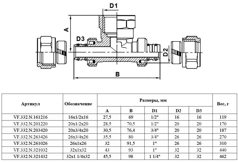 Тройник обжимной VALFEX VF.332.N ВР 1/2" Ду 20 Ру 25 переход на внутреннюю резьбу, никелированный латунный