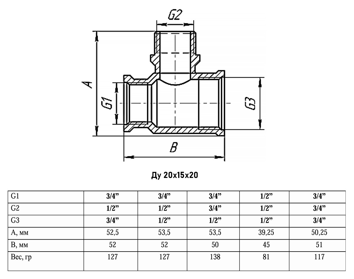 Тройник переходной VALFEX VF.132 ВР-НР 3/4"x1/2"x3/4" Ду 20x15x20 Ру 40 латунный