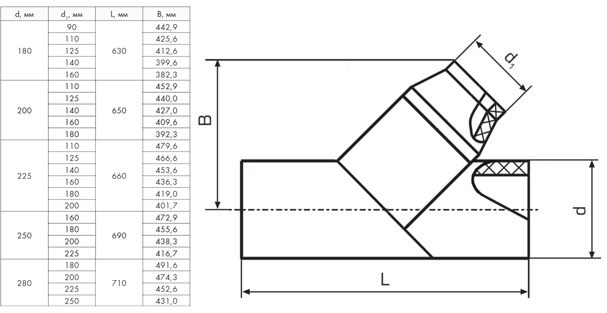 Тройник 250х160 мм SDR9 45° ПЭ100 неравнопроходный сварной сегментный ПНД