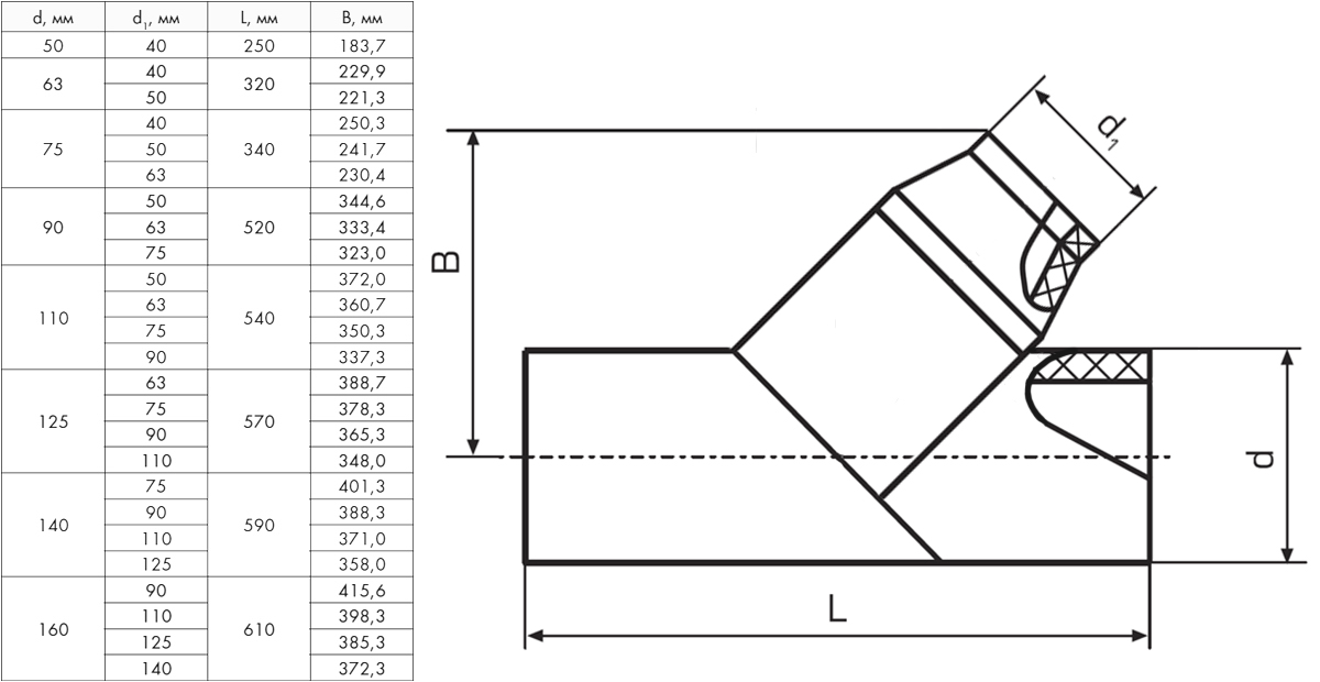 Тройник 50х40 мм SDR21 45° ПЭ100 неравнопроходный сварной сегментный ПНД