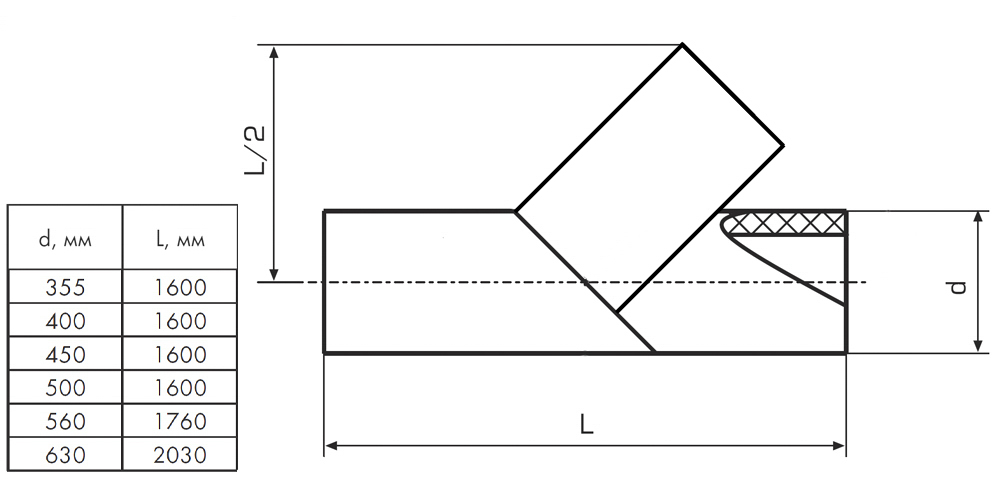 Тройник 630 мм SDR9 45° ПЭ100 равнопроходный сварной сегментный ПНД