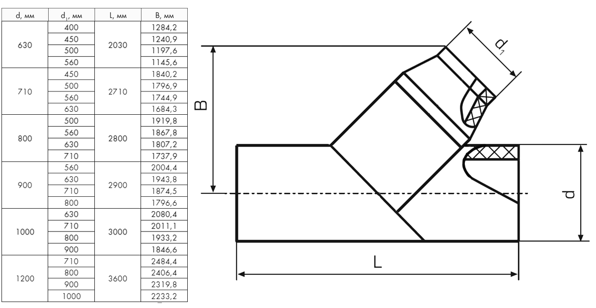 Тройник 900х560 мм SDR13,6 45° ПЭ100 неравнопроходный сварной сегментный ПНД