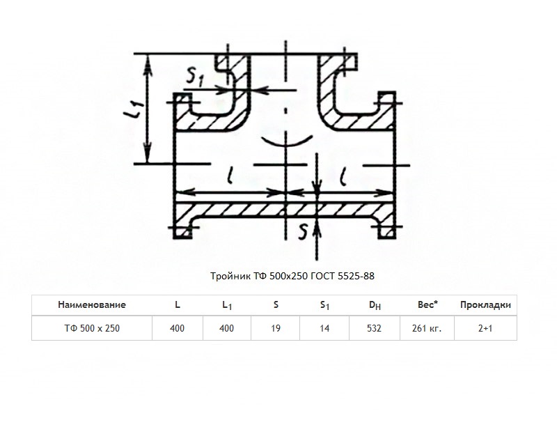 Тройник ТФ Ду 500х250 ВЧШГ ГОСТ 5525-88 чугунный фланцевый