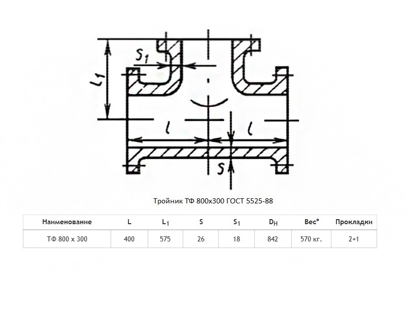 Тройник ТФ Ду 800х300 ВЧШГ ГОСТ 5525-88 чугунный фланцевый
