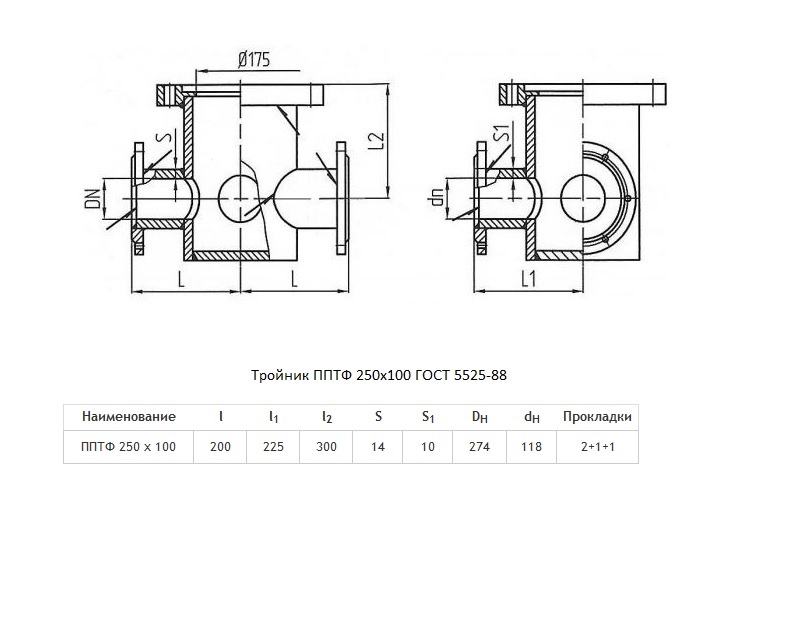 Тройник ППТФ Ду 250х100 ВЧШГ ГОСТ 5525-88 чугунный фланцевый с пожарной подставкой