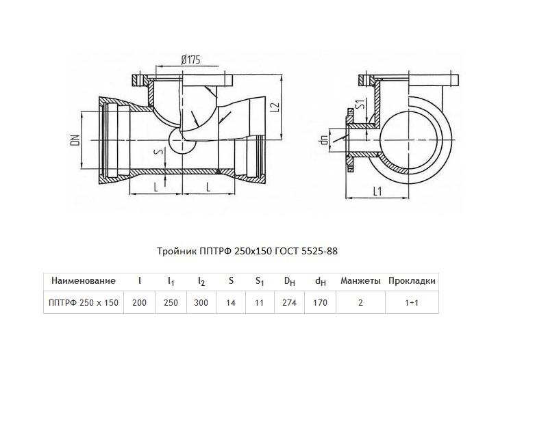 Тройник ППТРФ Ду 250х150 ВЧШГ ГОСТ 5525-88 чугунный раструб-фланец с пожарной подставкой