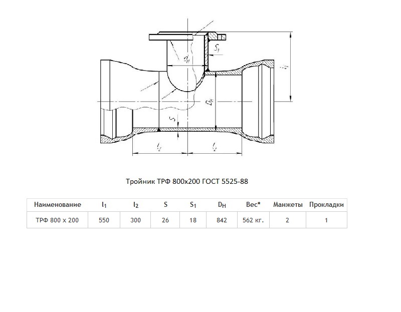 Тройник ТРФ Ду 800х200 ВЧШГ ГОСТ 5525-88 чугунный раструб-фланец