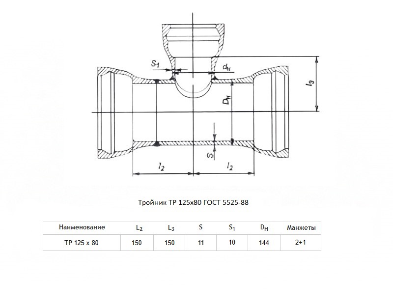 Тройник ТР Ду 125х80 ВЧШГ ГОСТ 5525-88 чугунный раструбный