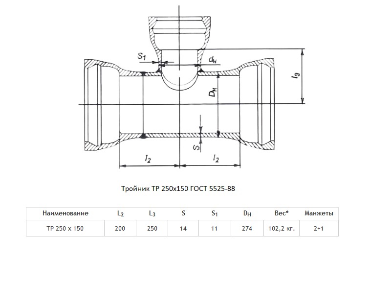 Тройник ТР Ду 250х150 ВЧШГ ГОСТ 5525-88 чугунный раструбный