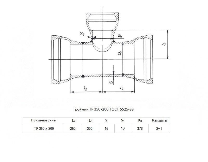 Тройник ТР Ду 350х200 ВЧШГ ГОСТ 5525-88 чугунный раструбный