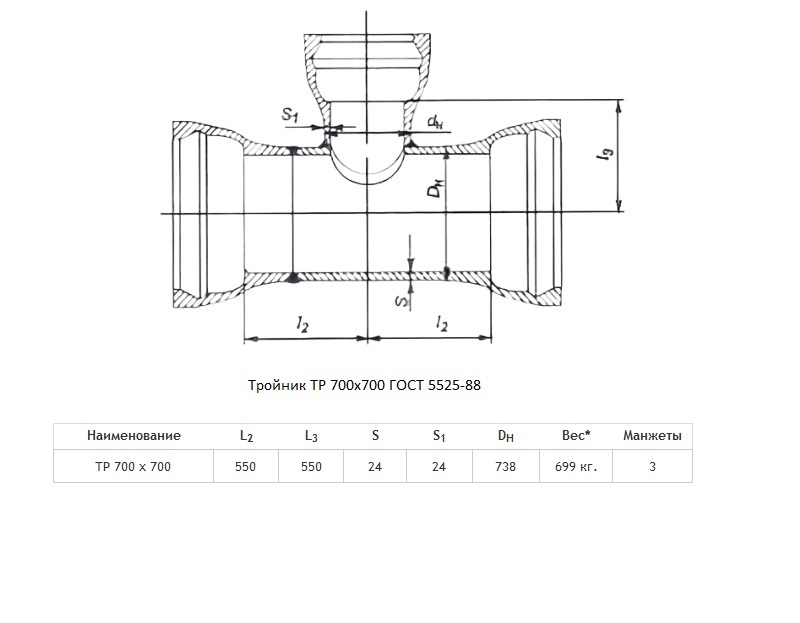Тройник ТР Ду 700х700 ВЧШГ ГОСТ 5525-88 чугунный раструбный