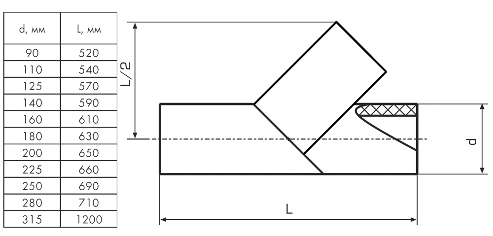 Тройник 110 мм SDR17 45° ПЭ100 равнопроходный сварной сегментный ПНД