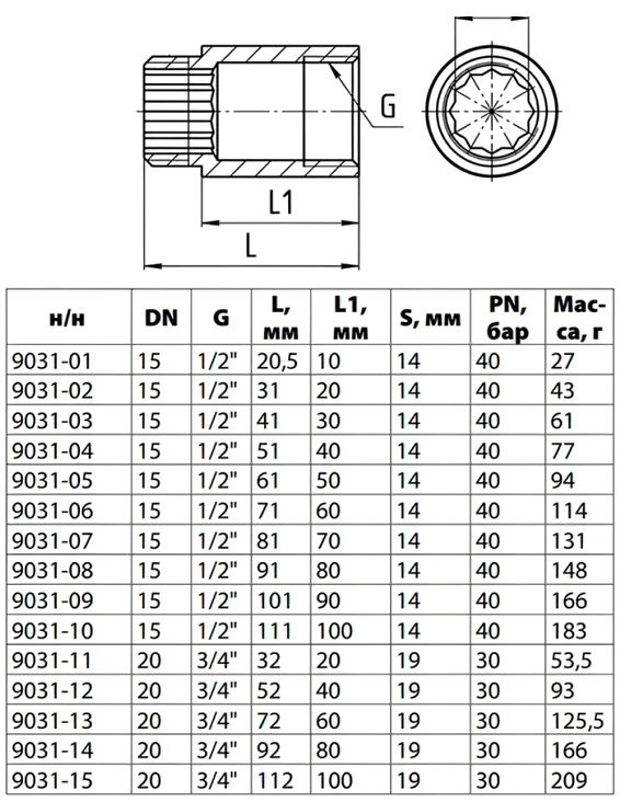 Удлинитель латунный Aquasfera 9031 DN 15 PN 40 резьба - 1/2'', покрытие - хром, L=20,5 мм, резьбовой ВР-НР, 9031-01