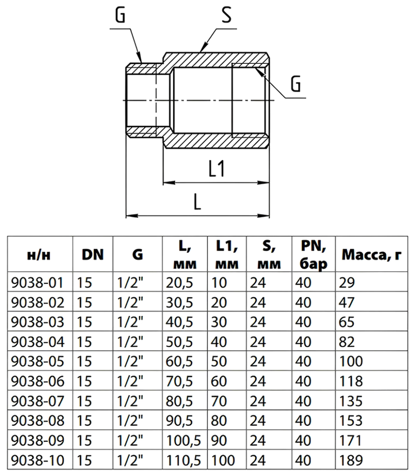 Удлинитель латунный Aquasfera 9038 DN 15 PN 40 резьба - 1/2'', покрытие - никель, L=100,5 мм, с наружным шестигранником, резьбовой ВР-НР, 9038-09