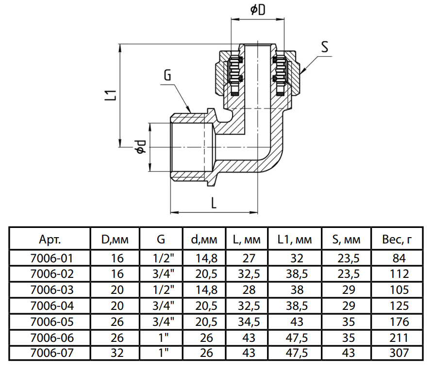 Угольник латунный Aquasfera 7006 DN 16х20 PN 16 резьба - 3/4'', покрытие - никель, резьбовой НР/компрессионный, 7006-02