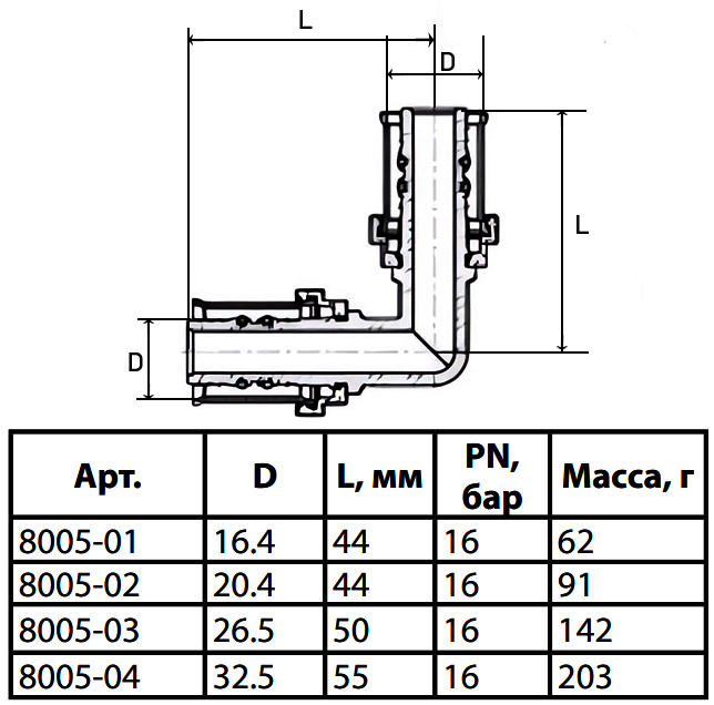 Угольник латунный Aquasfera 8005 DN 16.4 PN 16 покрытие - никель, пресс, 8005-01