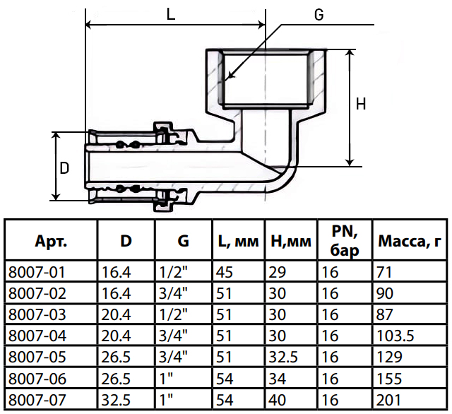 Угольник латунный Aquasfera 8007 DN 15x20.4 PN 16 резьба - 1/2'', покрытие - никель, резьбовой ВР/пресс, 8007-03