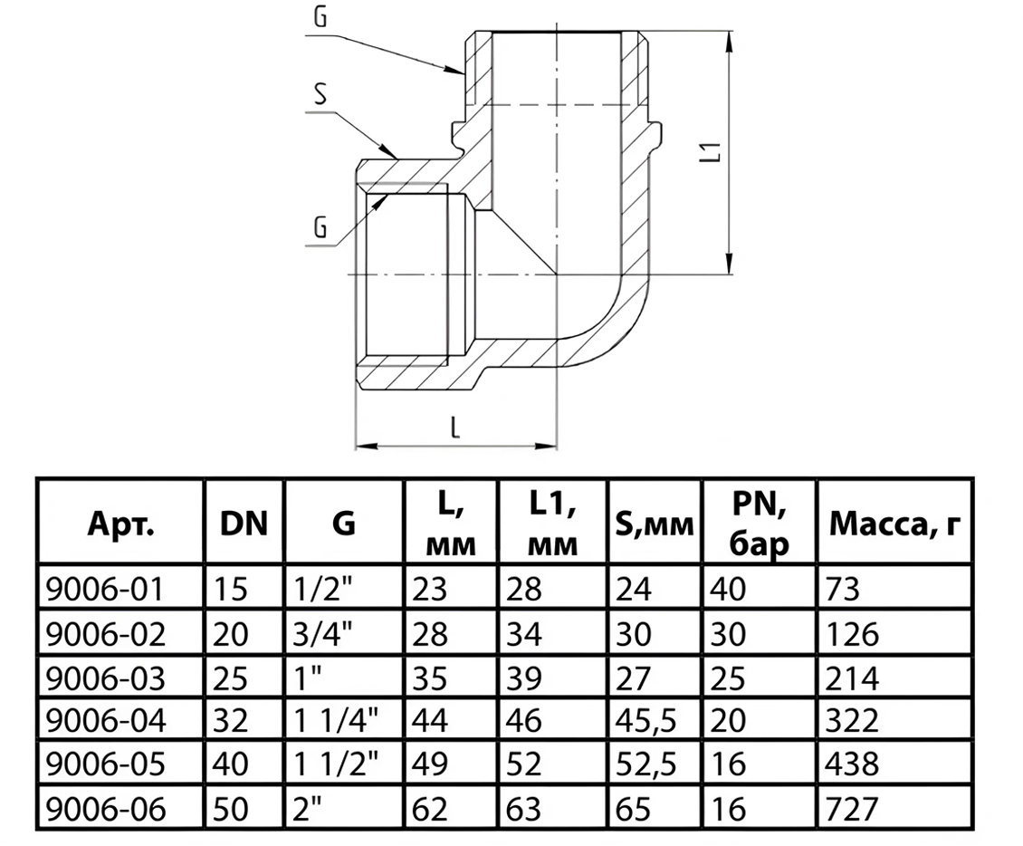 Угольник латунный Aquasfera 9006 DN 50 PN 16 резьба - 2'', покрытие -никель, с ребордой, резьбовой ВР-НР, 9006-06