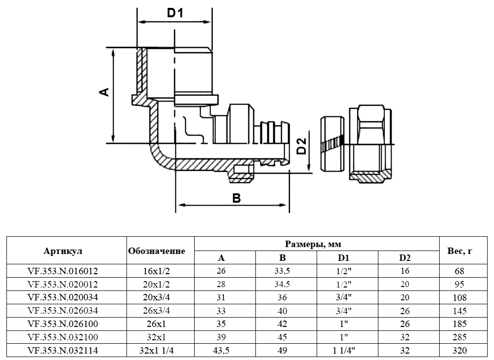 Угольник обжимной VALFEX VF.353.N НР 3/4" Ду 20 Ру 25 переход на наружную резьбу, никелированный латунный