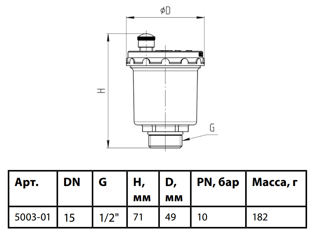 Воздухоотводчик автоматический латунный Aquasfera 5003 DN 15 PN 10 резьба - 1/2'', резьбовой НР, 5003-01