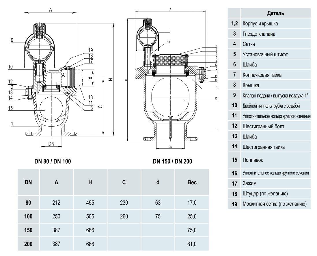 Воздушный вантуз Hawle 9835 DN 80/455 мм PN6 двухступенчатый с рабочим клапаном