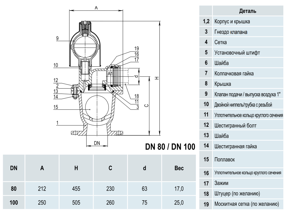 Воздушный вантуз Hawle 9836 DN 80/455 мм PN16 двухступенчатый с рабочим клапаном