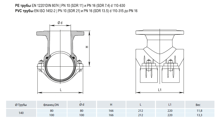 Врезной хомут HAWLE 5230 DN 140/100 PN 16 фланцевый системы Haku