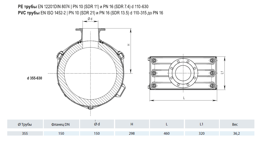 Врезной хомут HAWLE 5230 DN 355/150 PN 16 фланцевый системы Haku