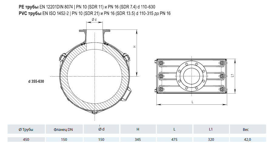 Врезной хомут HAWLE 5230 DN 450/150 PN 16 фланцевый системы Haku