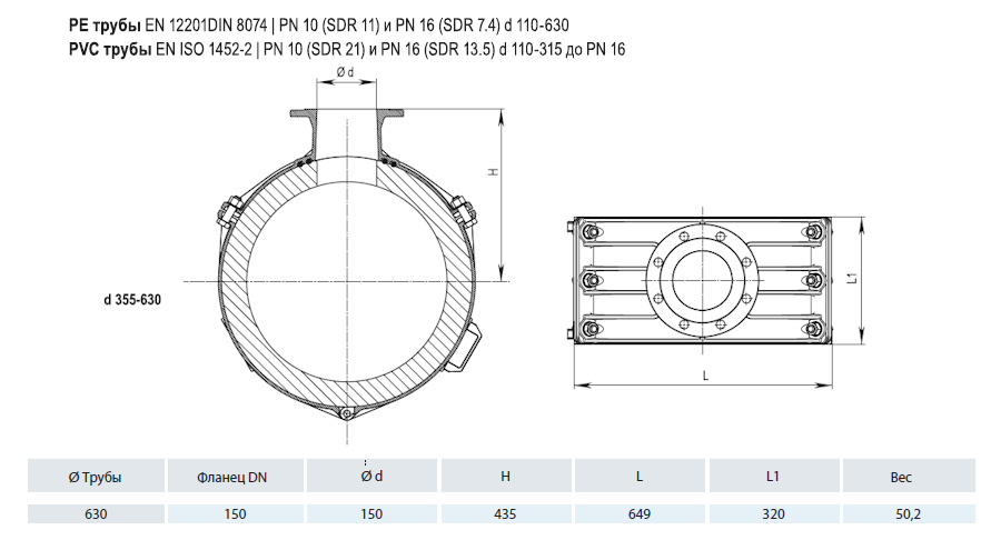 Врезной хомут HAWLE 5230 DN 630/150 PN 16 фланцевый системы Haku