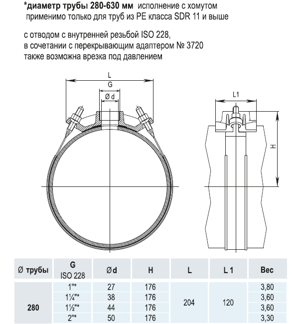Врезной хомут HAWLE 5250 DN 280 PN 16 системы HAKU с отводом с внутренней резьбой 2"*