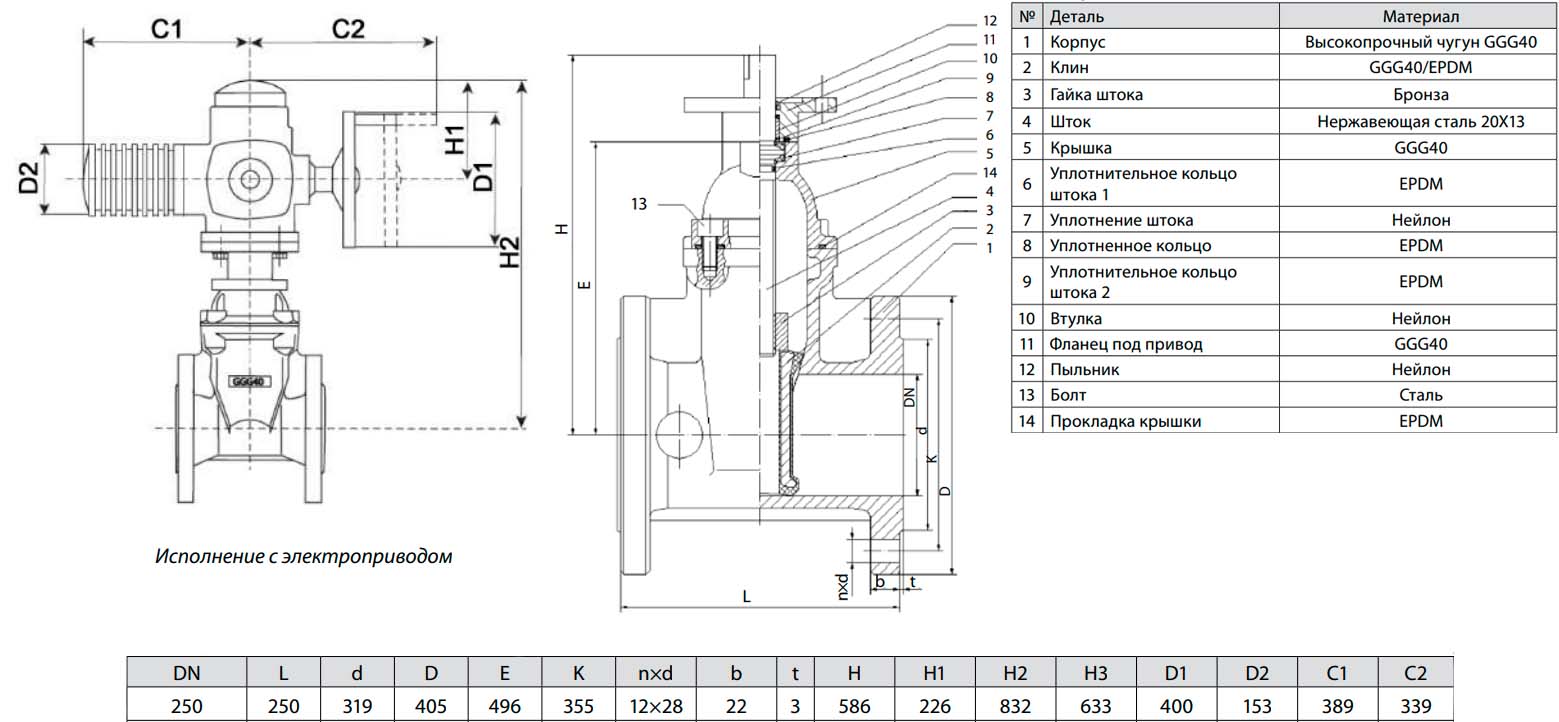 Задвижка ADL ГРАНАР KR12 Ду 250 Ру 16 с электроприводом AUMA SA 14.6 фланцевая клиновая